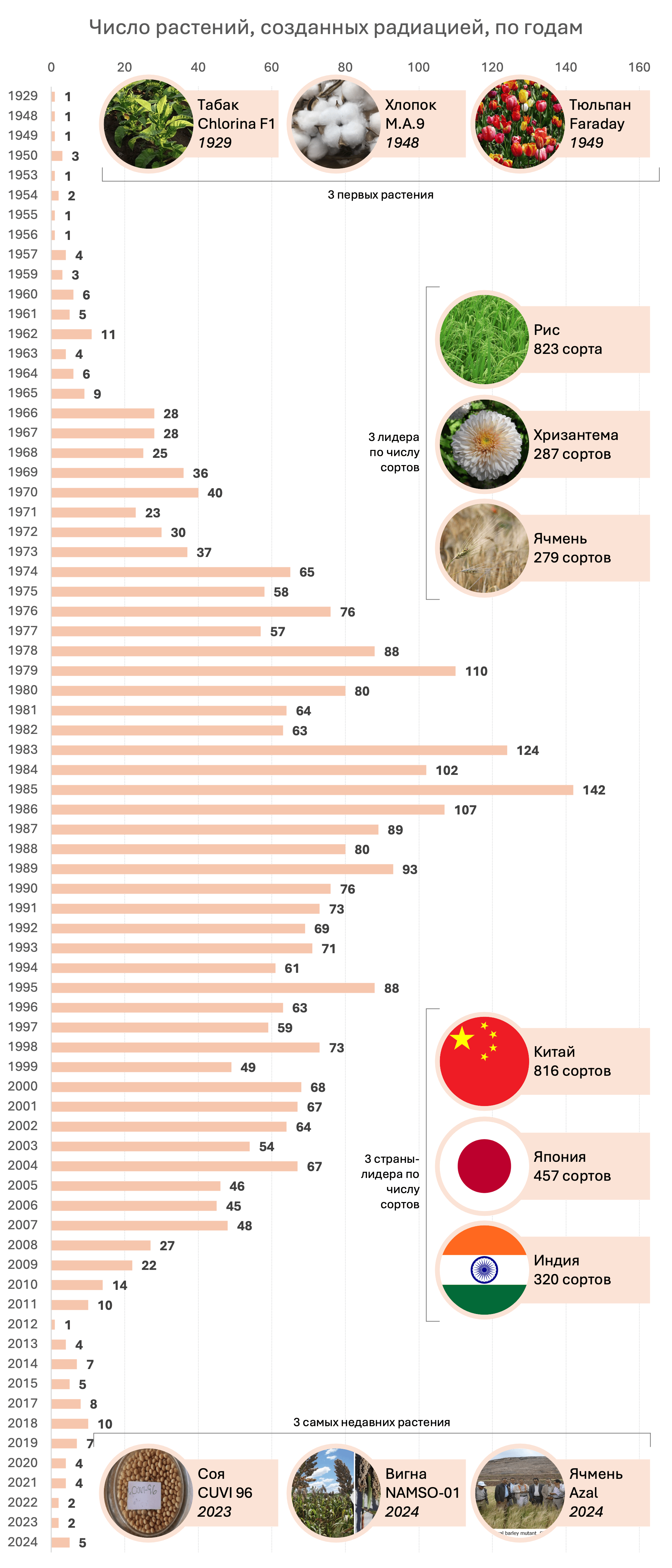 А «всего два сорта» — на самом деле внушительное достижение! Сейчас в мире зарегистрировано 2 977 новых видов растений — разновидности фруктов, овощей, бобовых и злаковых, цветов и ягод, созданных с помощью радиации. Информация на 2024 год — еще плюс 5 сортов.