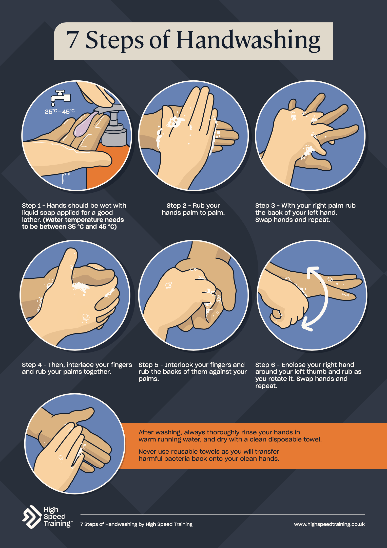 - После мытья всегда тщательно ополосните руки под тёплой проточной водой и высушите чистым одноразовым полотенцем.