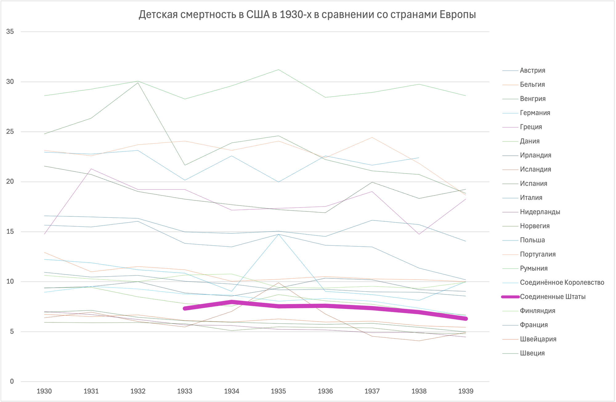 Мне не удалось подтвердить это утверждение. Сравнительный анализ данных о младенцах в 1930-е годы провести не позволили отсутствующие данные, удалось лишь найти информацию про конец сороковых, начало пятидесятых. Из собранной информации нельзя сделать вывод, что в США творилось совсем уж что-то безобразное. В 1950 году отставание от лидера, Швеции, было в 1% пункт, а вот дела в замыкающей Европу Польше были в четыре раза хуже [3].