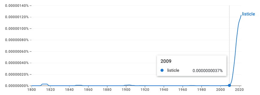 К слову, сервис подсчёта употребления слов Google Ngram Viewer показывает, что взлёт использования слова listicle начался в конце 2000-х годов. По остальным словам такой статистики нет.